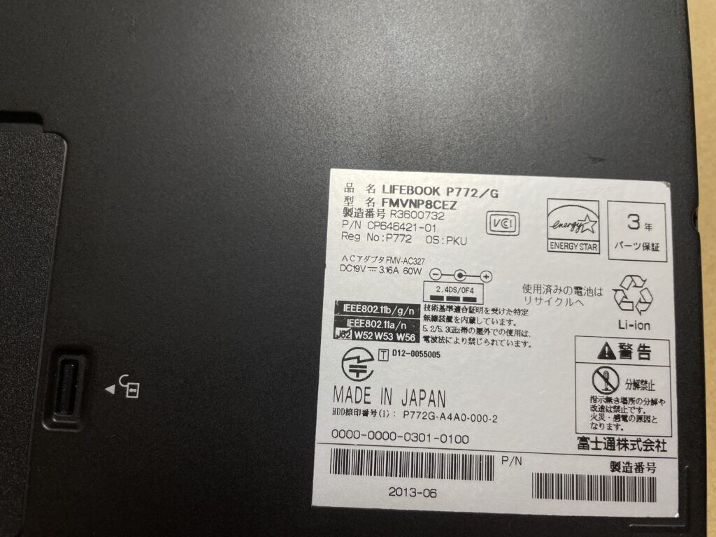 | 光学ドライブ | ナシ/空ベイ有 | 無線LAN | IEEE 802.11n/a/b/g |